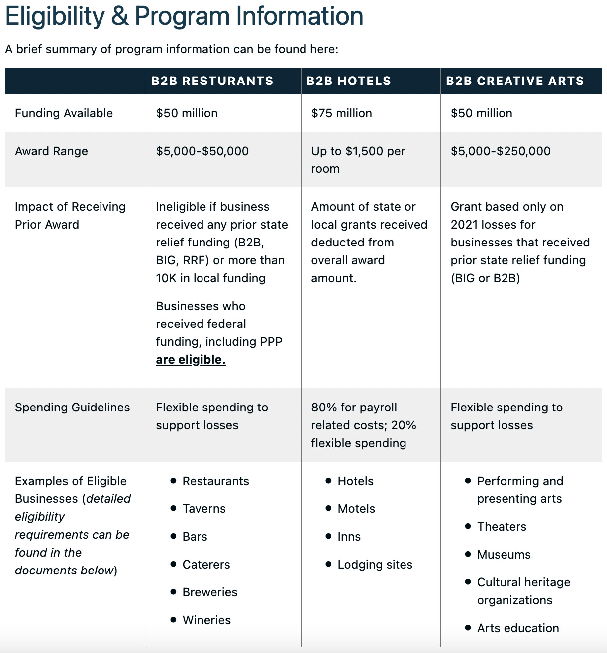 A screenshot of a chart detailing businesses eligible for the state’s Back to Business (B2B) grant program.